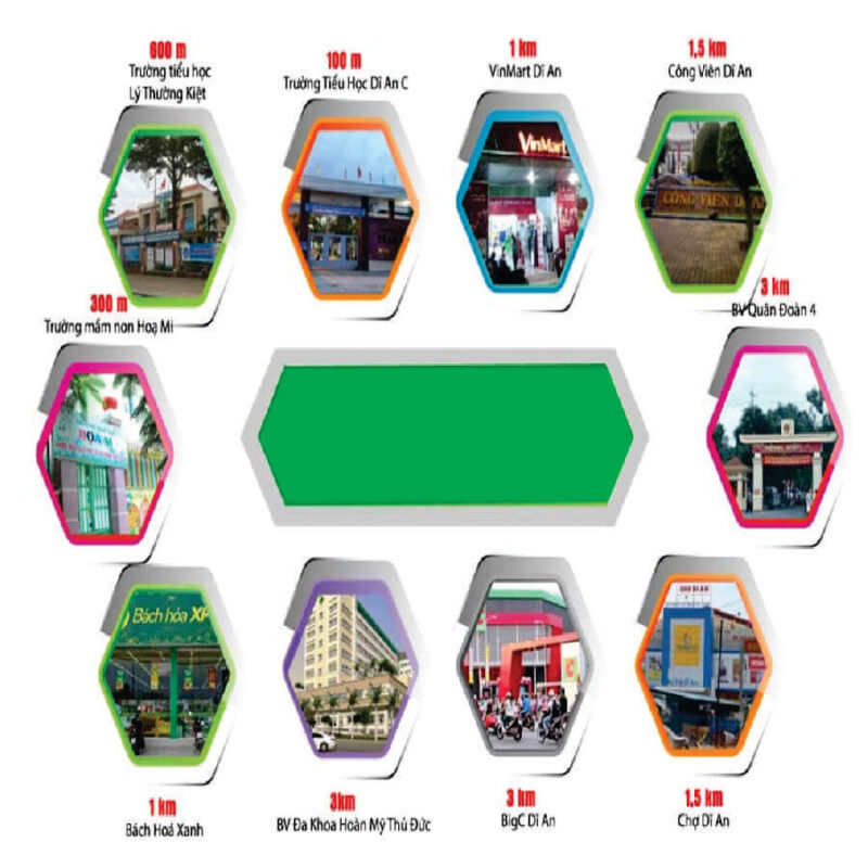 Được thừa hưởng chuỗi tiện ích hiện hữu, hiện đại của khu vực như: trung tâm hành chính, BigC Dĩ An, Điện máy xanh, bệnh viện, trường học, khu công nghiệp... Cư dân chỉ mất từ 5 - 30 phút để di chuyển đến các địa điểm này.
