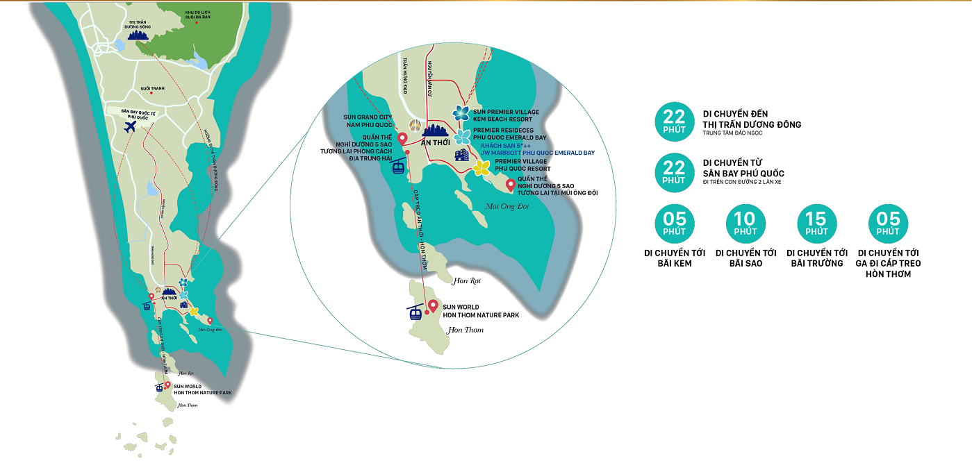 Từ vị trí dự án, người dân có thể di chuyển đến các địa điểm du lịch nổi tiếng xung quanh chỉ trong vòng 30 phút: Bãi Kem, Bãi Saom Bãi Trường, Hòn Thơm, Sân bay Phú Quốc, thị trấn Dương Đông...